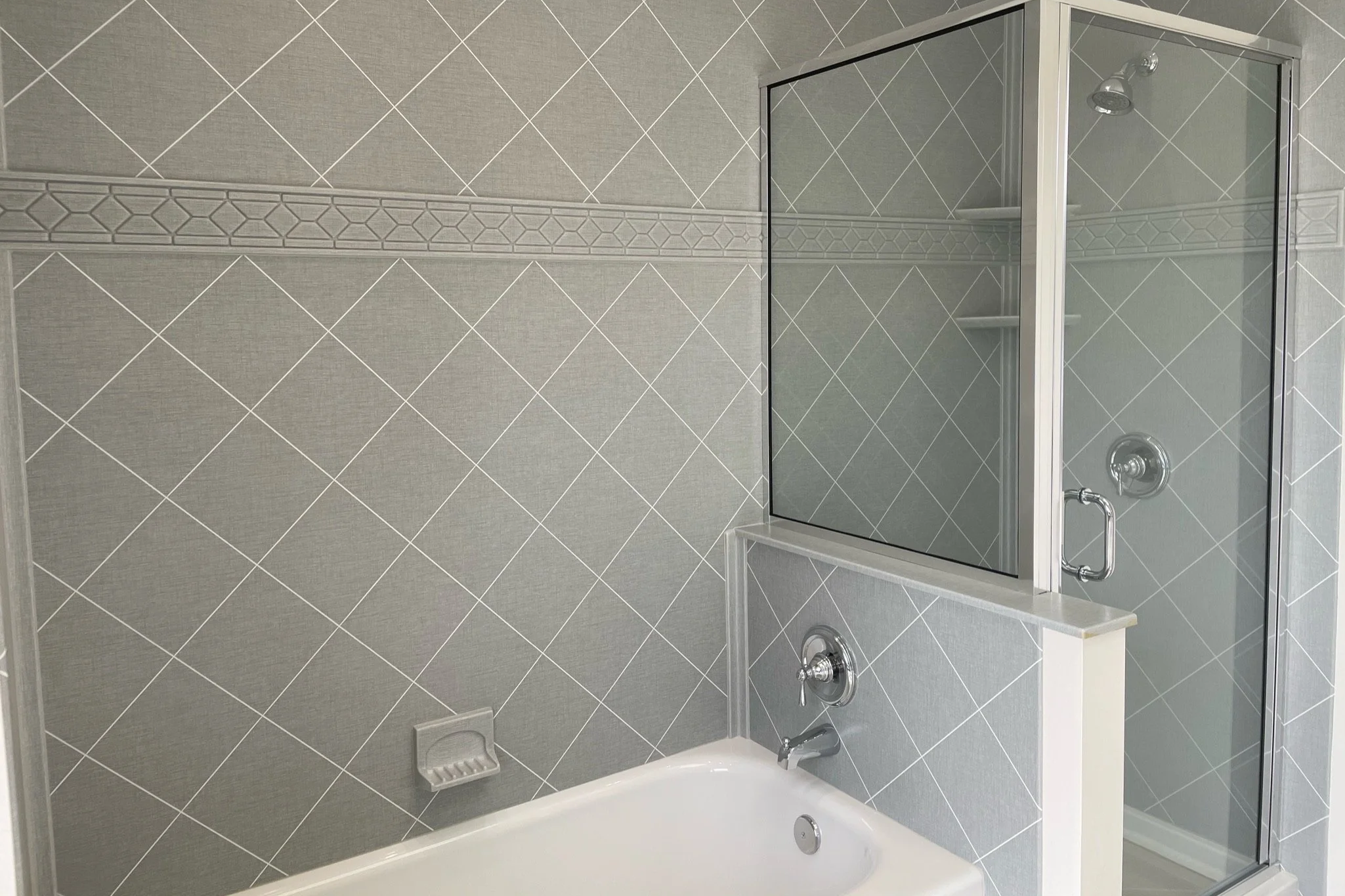 Traditional tile surrounds often include grout lines that collect mold and soap residue.